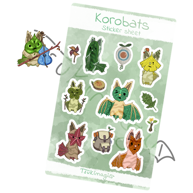 Les Korogus de l'univers de Zelda sont devenus des chauves-souris avec cette planche de stickers ! Retrouvez 6 Korogus chauves-sourifiés et 6 mini-stickers thématiques pour décorer vos cahiers, agenda, classeurs, bujo...